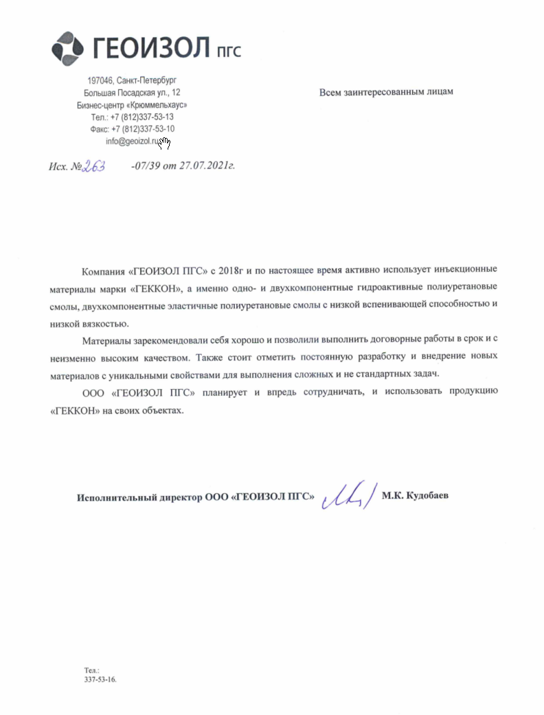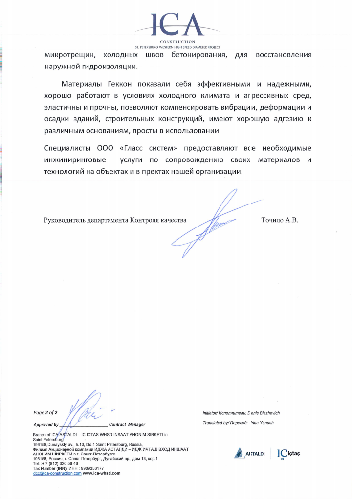 Многофункциональный комплекс "Лахта центр" успешно сотрудничает с ООО «Гласс Систем» по инъекционной и обмазочной гидроизоляции подземных сооружений, устройству промышленных полиуретановых полов, устройству бесшовной наливной полиуретановой кровли. Работы выполнялись с использованием материалов линейки «ГЕККОН». Предложенные технологии и используемые материалы показали себя эффективными и надежными.