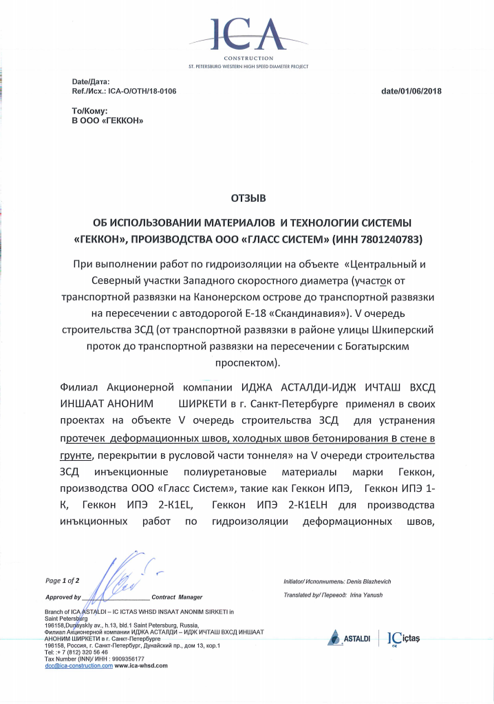Западный Скоростной Диаметр Выполнение работ по гидроизоляции на объекте «Центральный» и «Северный» участки Западного скоростного диаметра. Была поставлена задача устранить протечки деформационных швов, холодных швов бетонирования в стене и в грунте, а также перекрытии в русловой части тоннеля. Для достижения поставленной цели использовались инъекционные полиуретановые материалы торговой марки Геккон, производимые ООО «Гласс Систем». Задача по иньекционной гидроизоляции была выполнена успешно.
