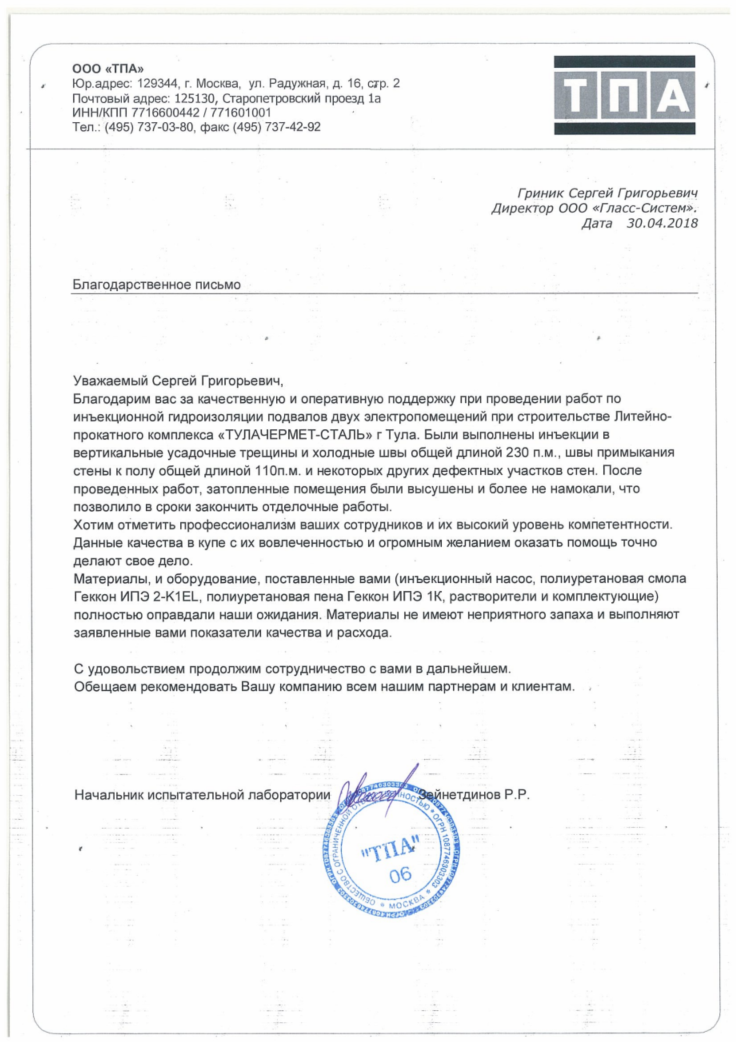 Петербургский Метрополитен Для Метроплитена в городе Санкт - Петербург была разработана технология по герметизации мест ввода инженерных сетей, устранению протечки по швам тюбингов красной ветки Метрополитена. А также восстановлению герметичности холодных швов вентиляционных шахт. Эффективно решены задачи по инъекционной гидроизоляции. Материалы производства ООО «Гласс Систем» успешно проходят необходимые испытания и сертификацию для решения поставленной задачи.